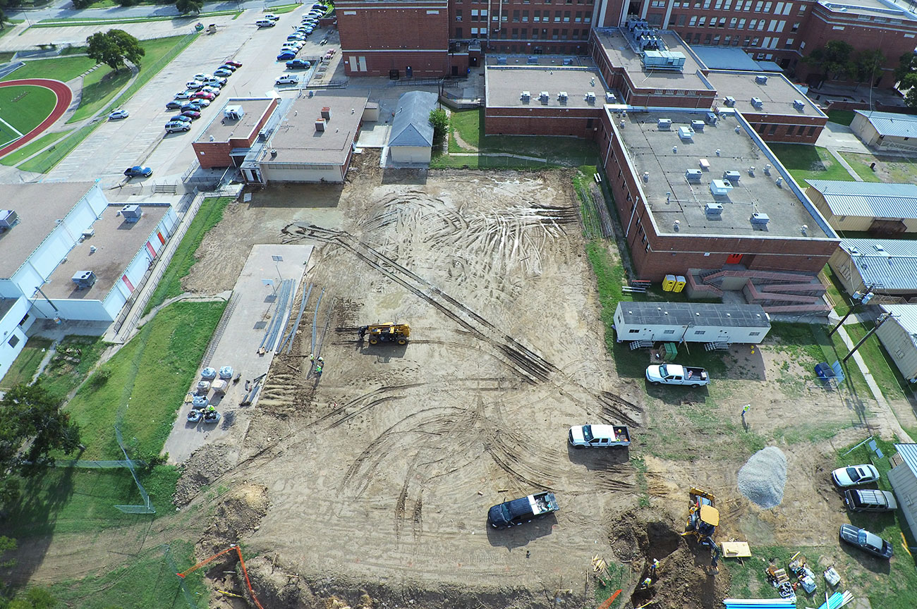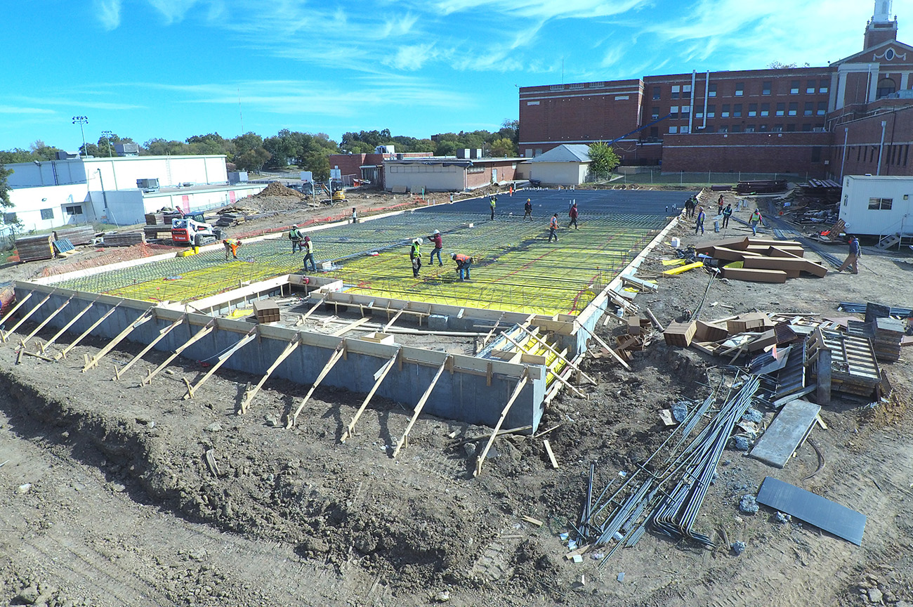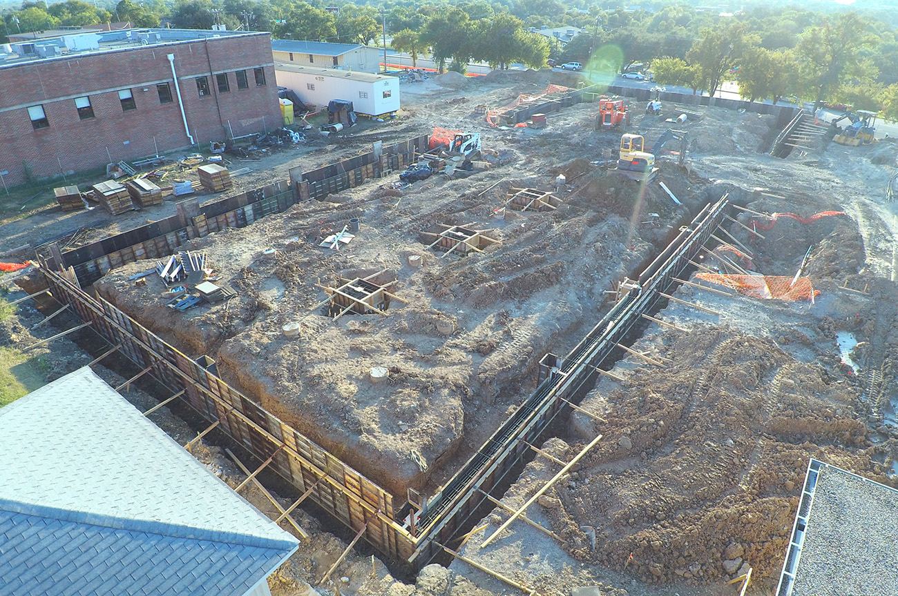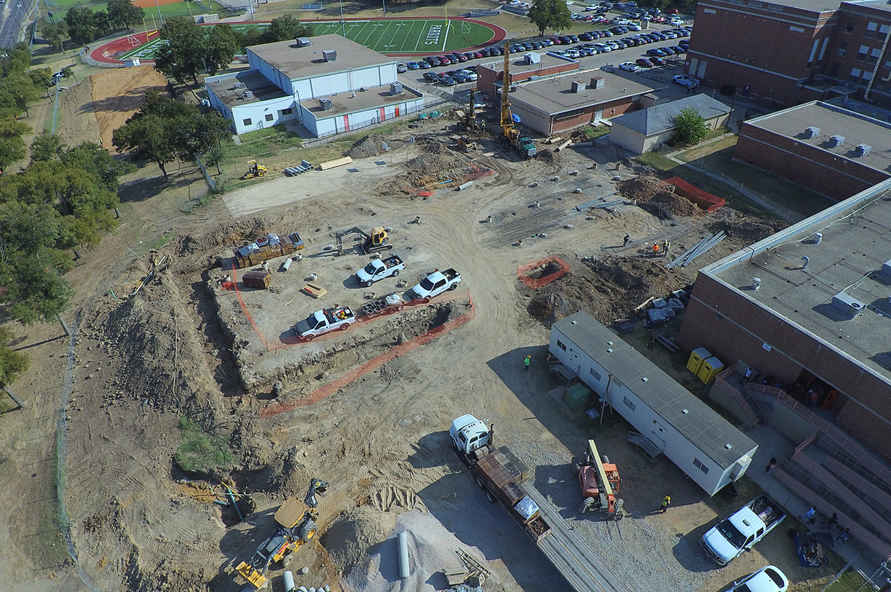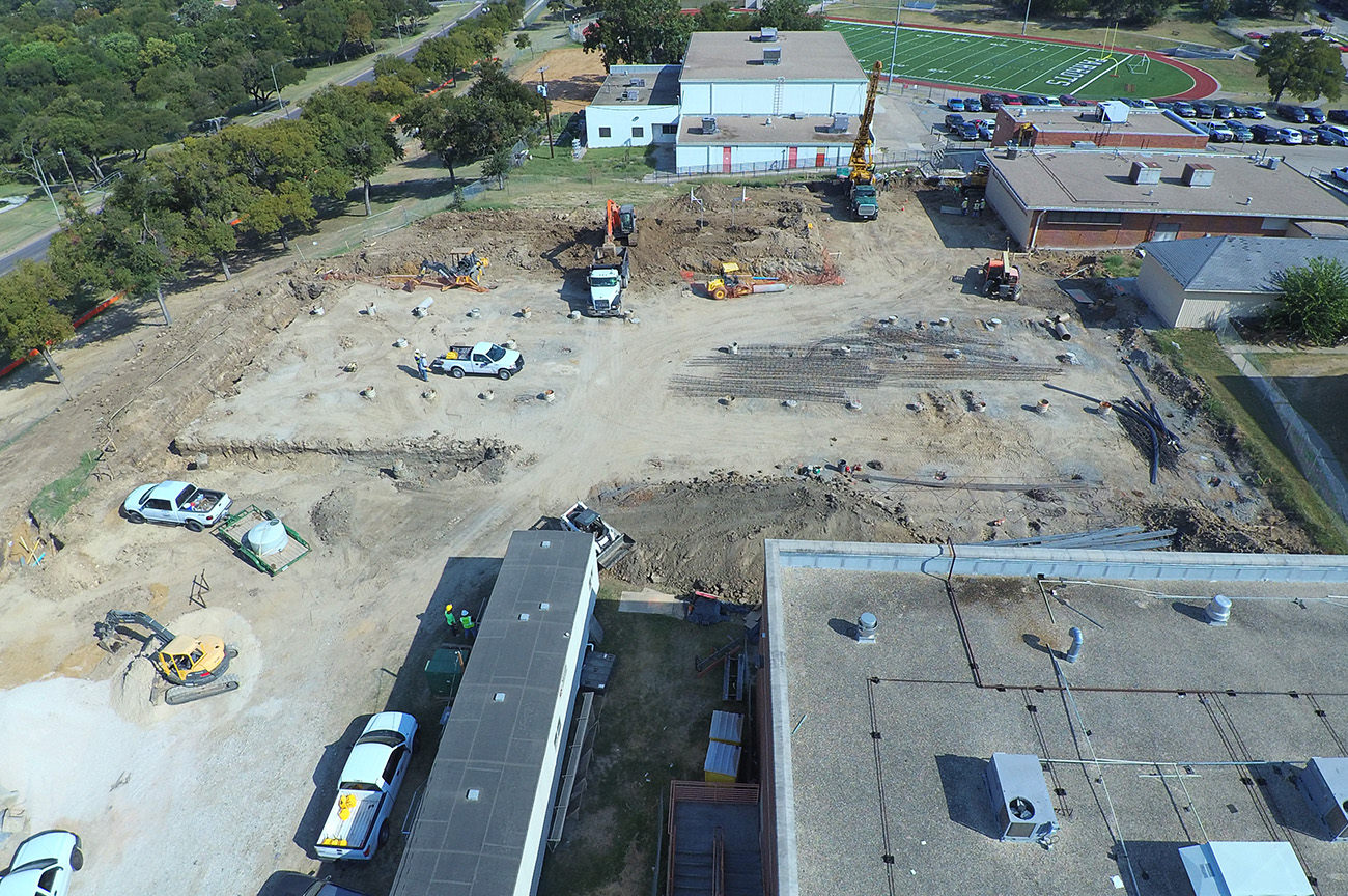 15,500sqft of classroom addition. (73) piers, formed grade beams up to 6’ depth, 10” slab with #6’s @ 6” centers double mat top & btm. 3,100sqft of field house addition. (25) piers and formed to same specifications as the classroom addition.